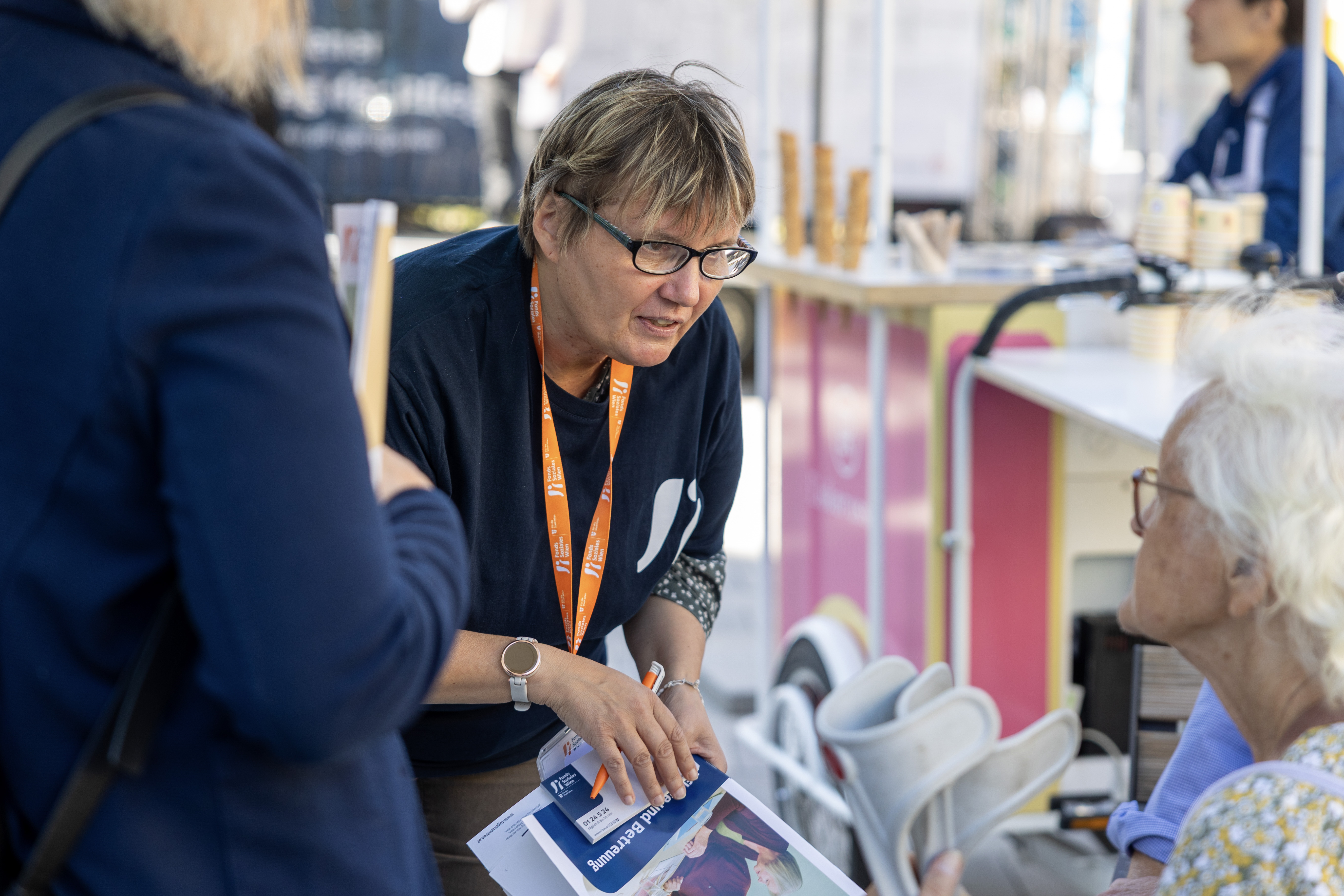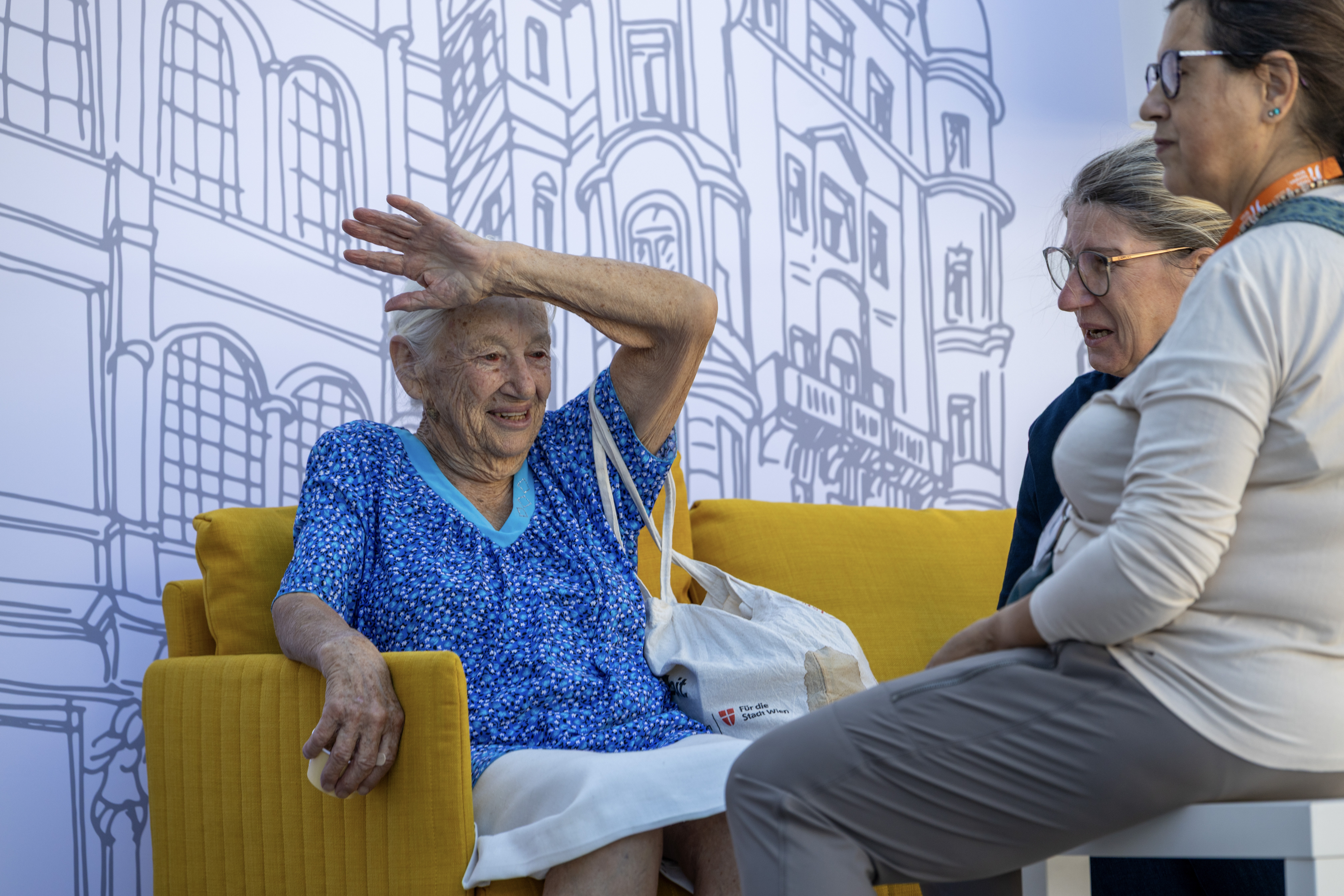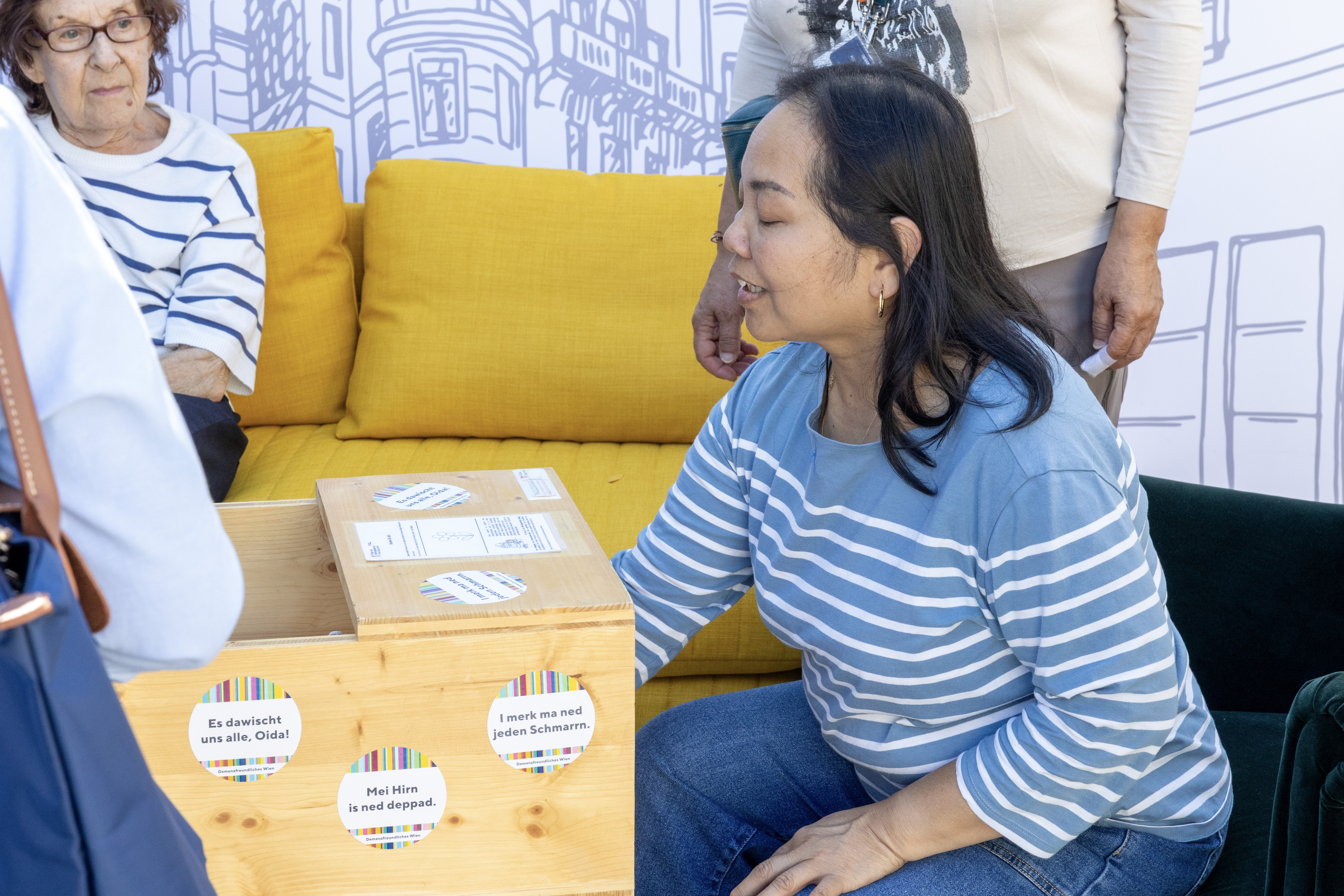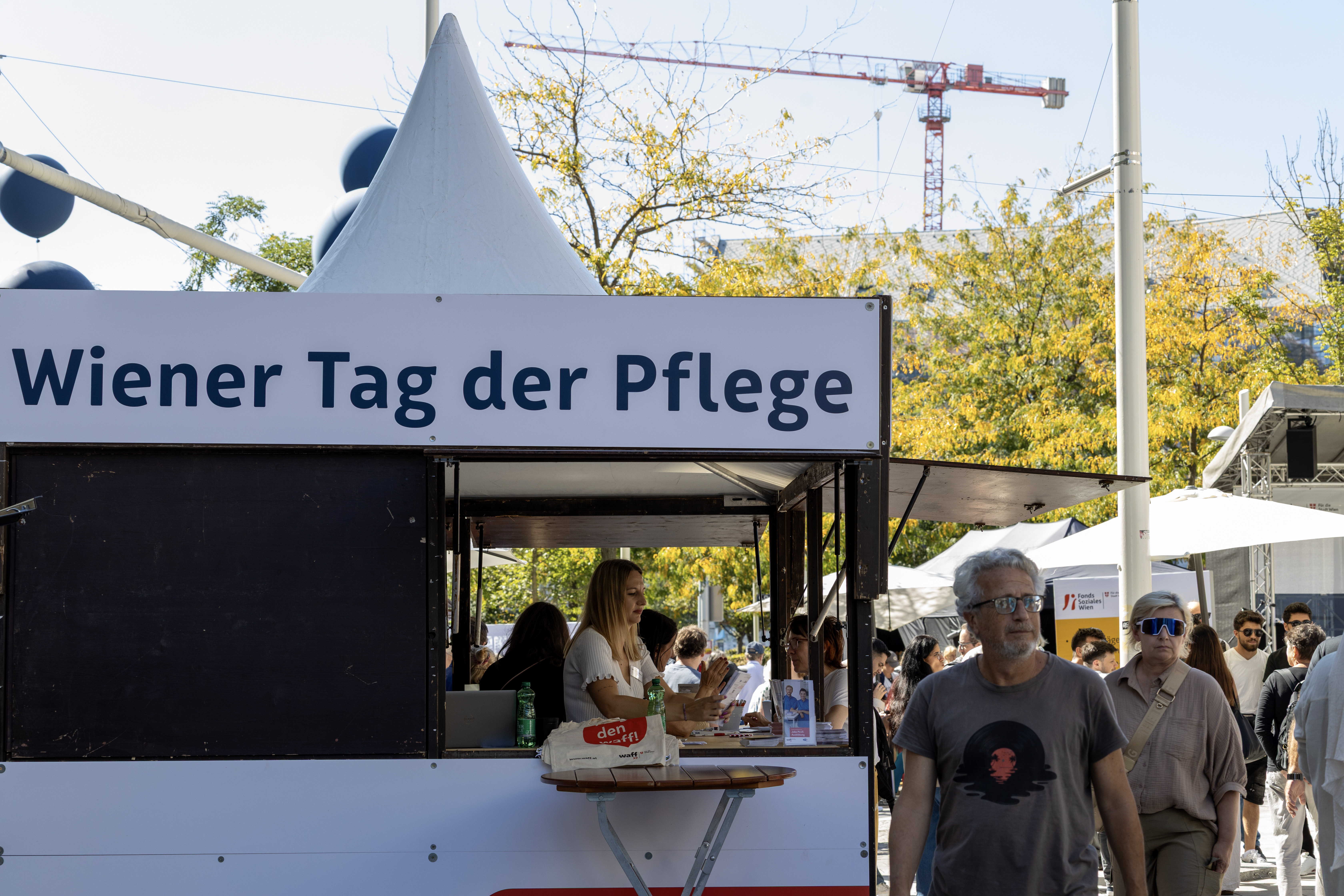 Im Zentrum des Tages standen die Beratungshütten und die Wiener Pflege-Couch. Dort präsentierte das FSW-Kund:innenservice gemeinsam mit seinen Partnerorganisationen das breite Spektrum der Pflege- und Betreuungsangebote in Wien. Mit dabei waren unter anderem:
